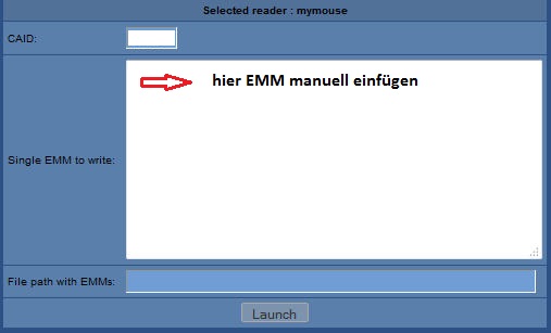 Das WebIf bietet unter dem Tab Reader die Möglichkeit, einzelne EMM manuell auf die SmartCard zu schreiben: