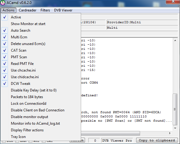 Monitor von ACamd anzeigen lassen. Beim DVBViewerPro geht das über den Tab "Plugins". Im Monitor links außen den Tab "Actions" anklicken. Es sollten folgende Haken gesetzt sein: