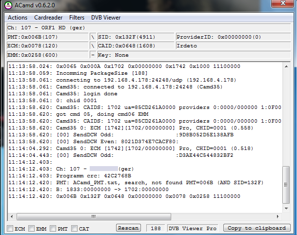 Während ACamd ruht, arbeitet nun vPlug als CA-EMU. Man erleichtert vPlug die Arbeit, indem man die nicht benötigten CAIDs auf ignore setzt. Siehe auch die Spalte ignored, wo in diesen Fällen ein yes steht. In dem Beispiel wird ein HD-Sender encrypted.