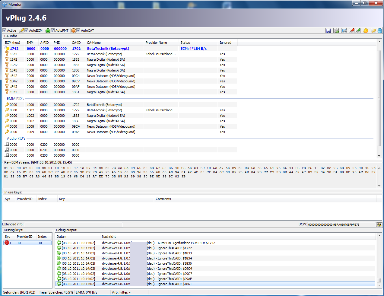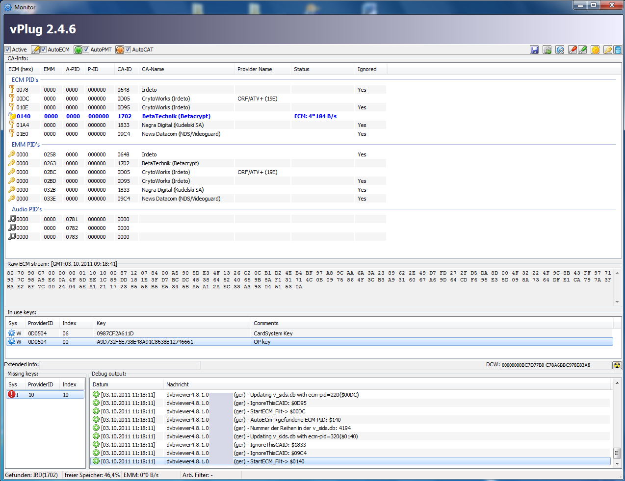Der vPlug-Monitor zeigt an, dass die ECM über CS kommen (AutoECM) und er nichts machen muss. Interessant sind hier aber auch die zahlreichen Auskünfte über die Bestandteile des Streams sowie CAID's, PID's und dergleichen.